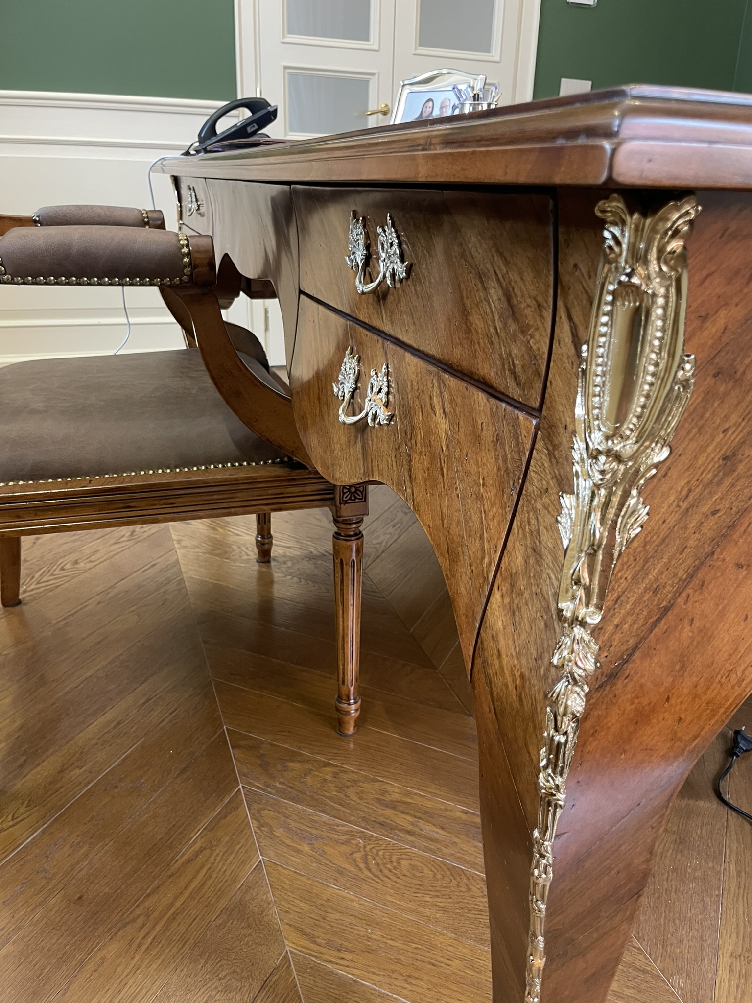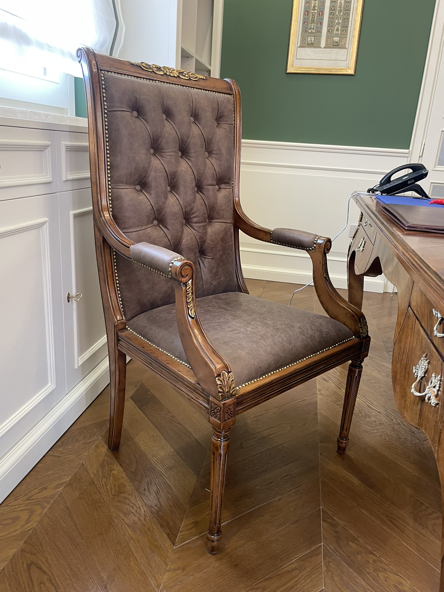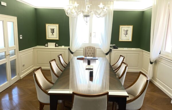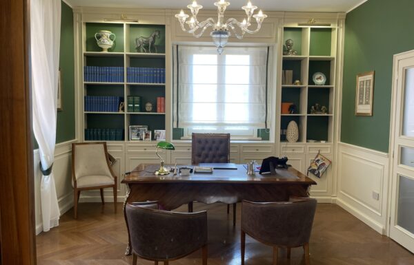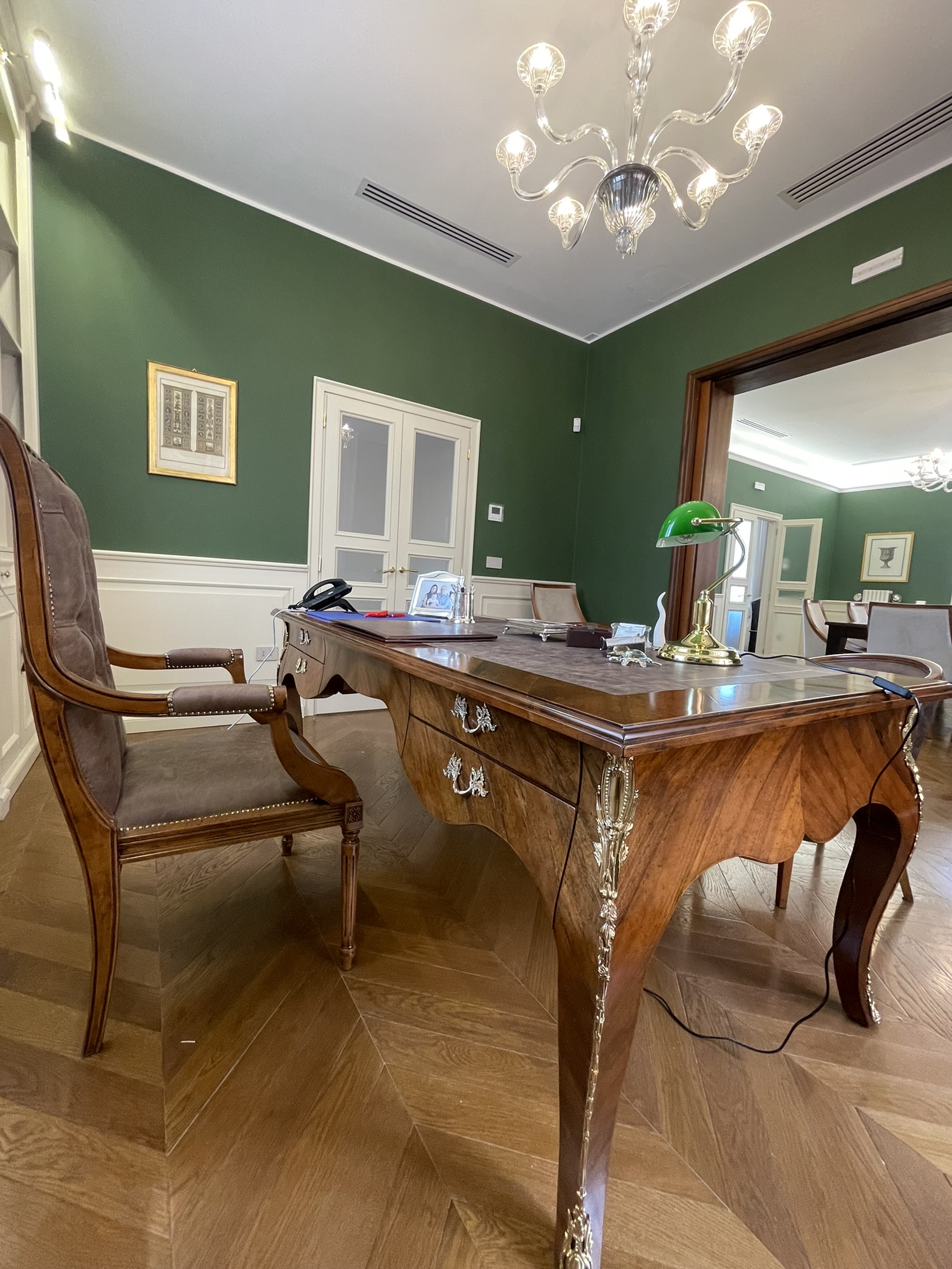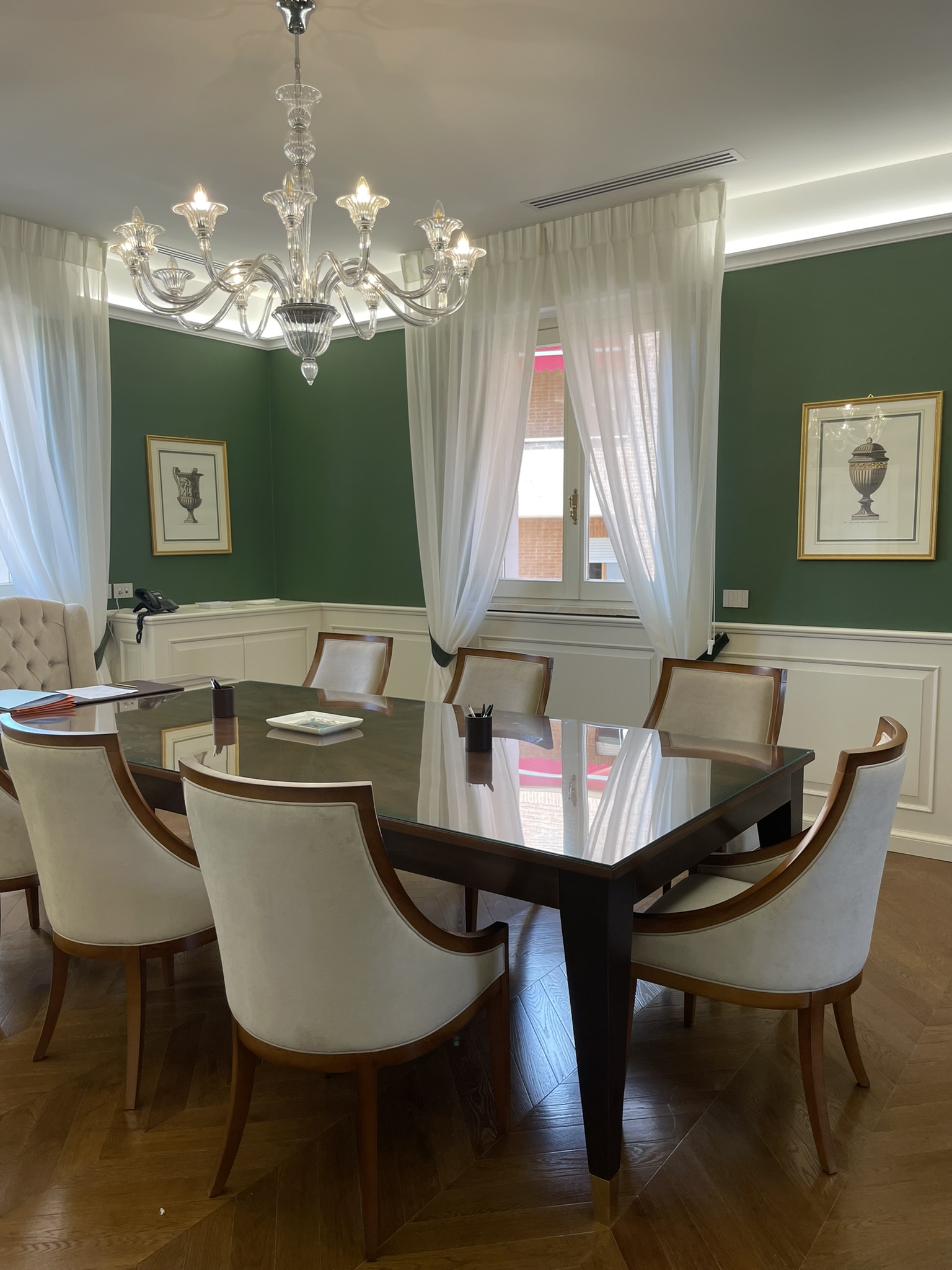 In merito alla selezione della scrivania, un elemento che il committente sognava fin dai tempi degli studi, e che rappresenta il fulcro dello spazio di lavoro, si sono affidati alle nostre proposte. Lo stesso approccio è stato adottato per il tavolo riunione, molto grande e con un bellissimo intarsio a raggera , tutte le sedie e gli imbottiti, assicurandoci che ogni elemento non solo rispettasse l’estetica generale, ma offrisse anche il massimo comfort e funzionalità.