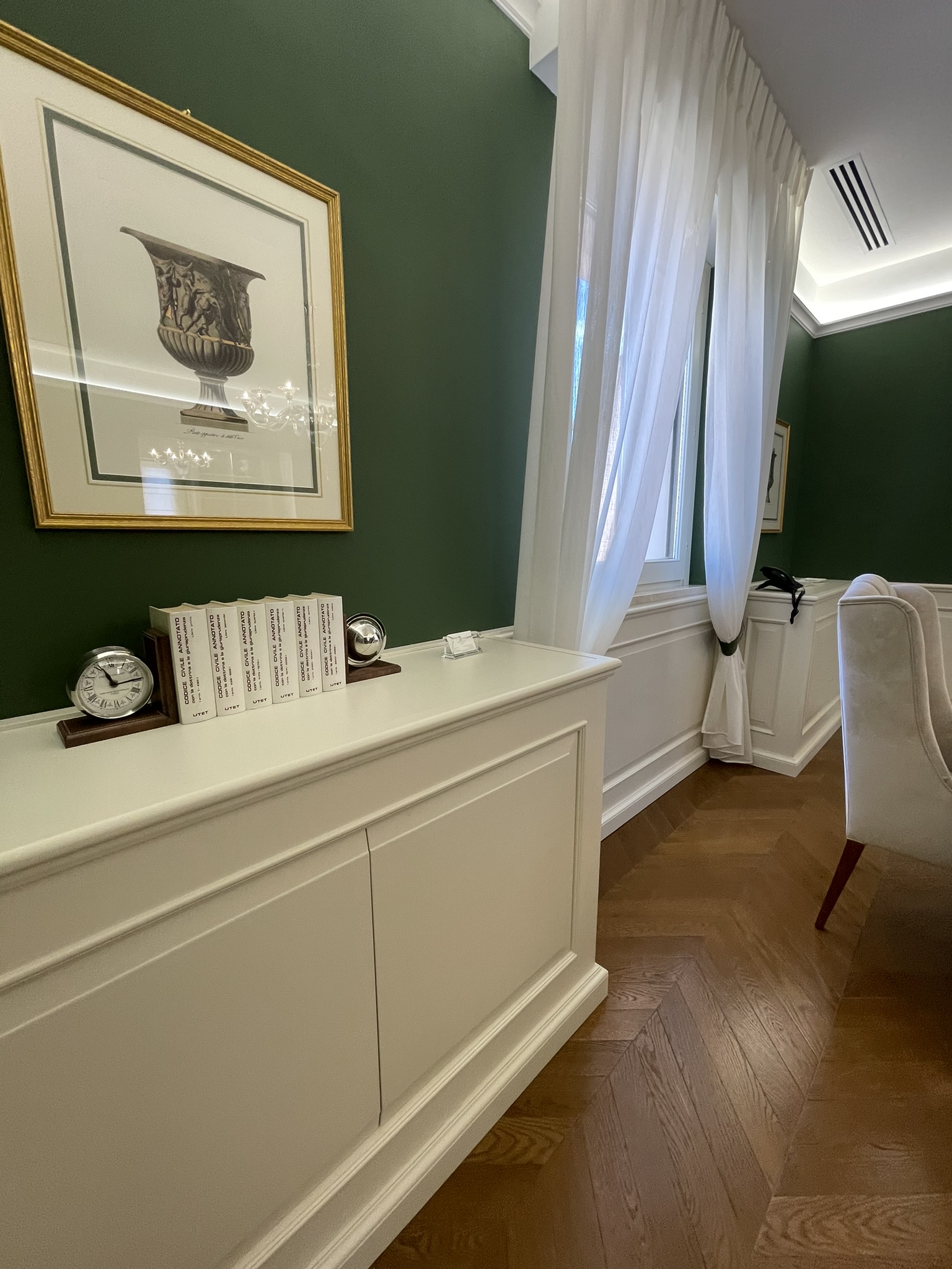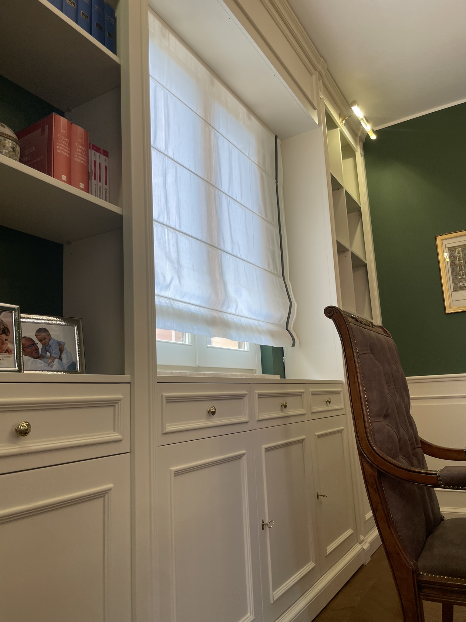 Una volta ottenuto il progetto preliminare, abbiamo concentrato la nostra attenzione sui dettagli della lavorazione delle librerie e degli armadi, integrando perfettamente questi elementi con la boiserie. Ogni pezzo è stato pensato per creare un ambiente armonioso e funzionale, che rispecchiasse l’eleganza e la professionalità richieste da uno studio notarile.